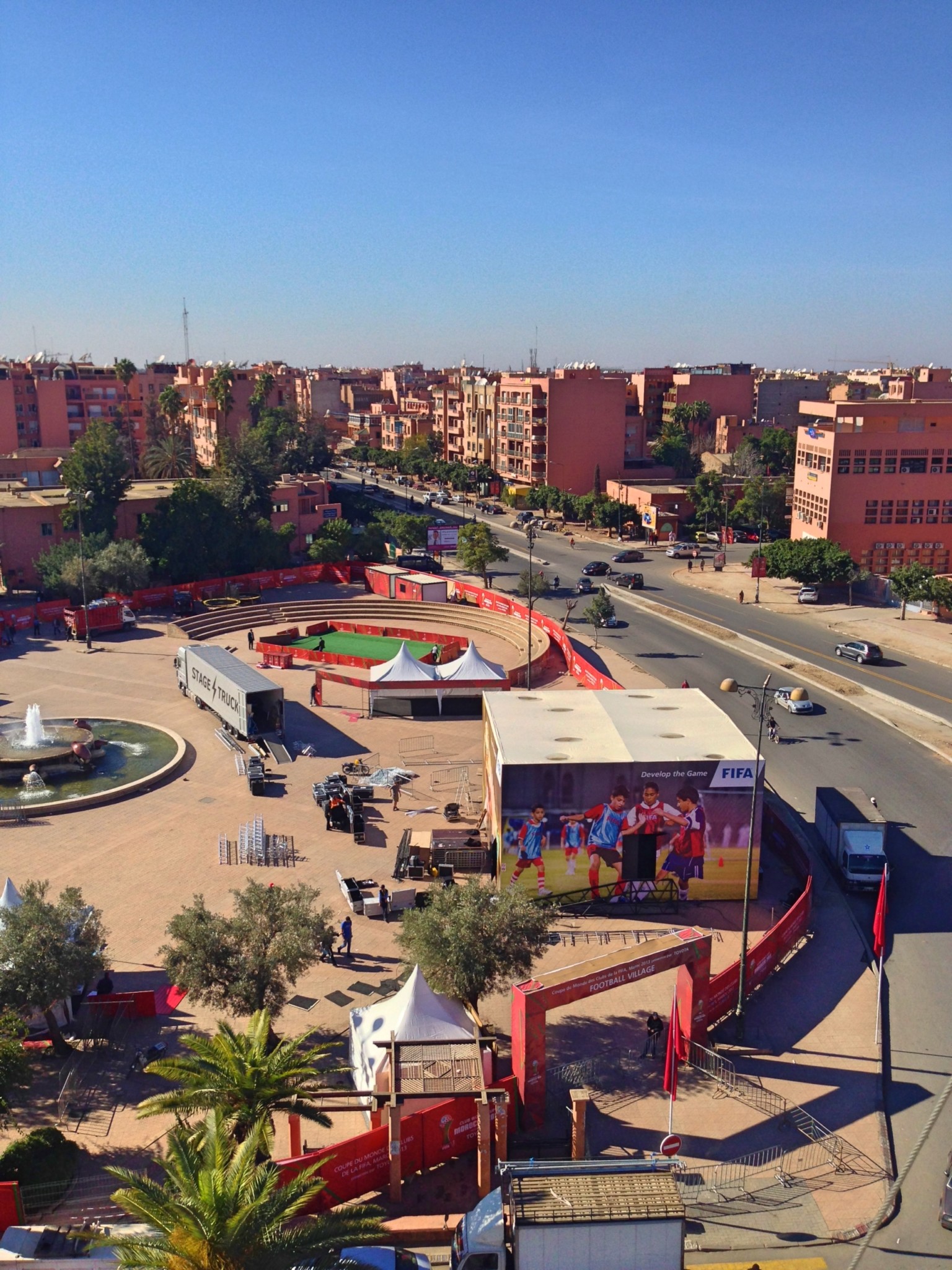 Kurz nach dem Einchecken im Hotel in der Neustadt von Marrakesch organisierten wir uns ein Taxi, das uns in Richtung des Stadions „Stade de Marrakech“ bringen sollte. Das Stadion liegt circa zehn Kilometer außerhalb von Marrakesch. Da die Verkehrssituation generell etwas kritisch in Marokko ist und bei Großveranstaltungen quasi zum Erliegen kommt, setzte uns der Taxifahrer an einer Kreuzung ab und wir mussten die restlichen Kilometer zum Stadion laufen.