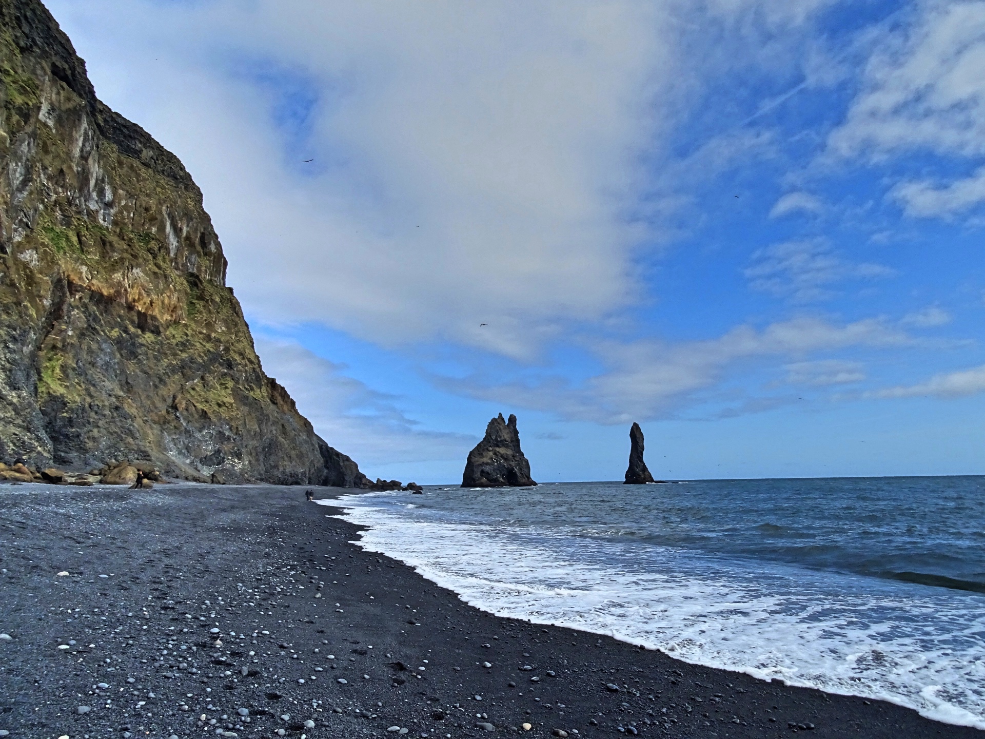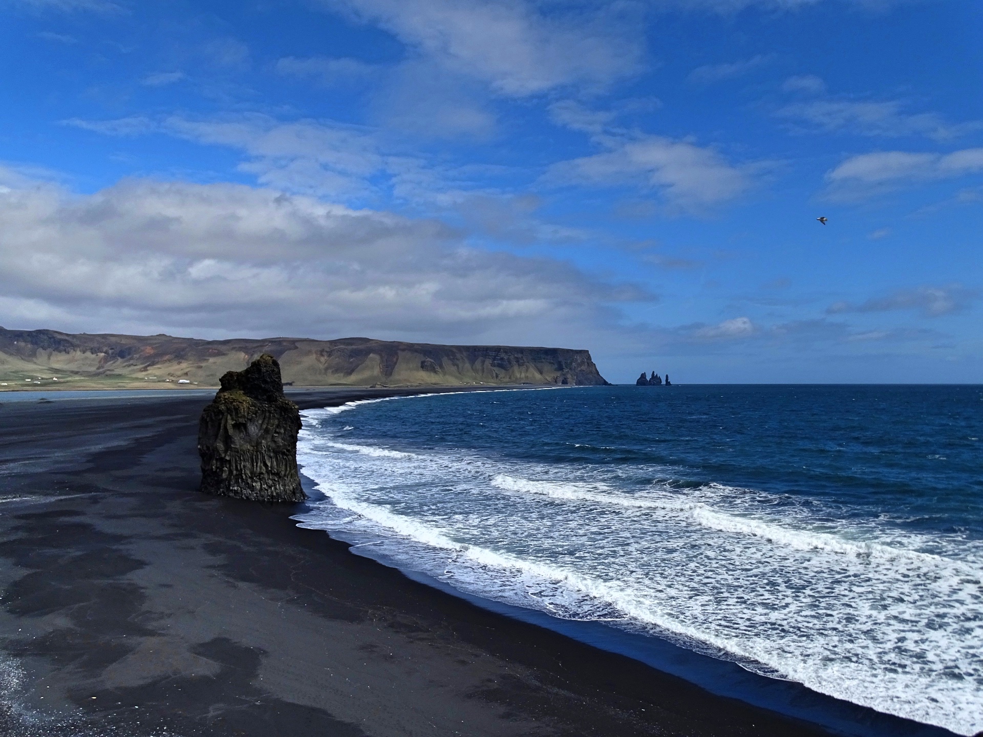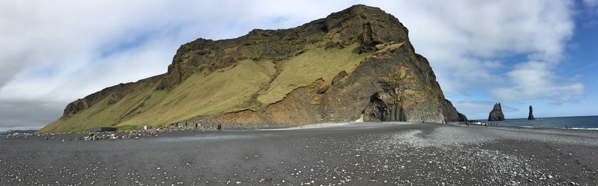 Fährt man wieder zurück auf die Hauptstraße und von dort Richtung Vík í Myrdal, kann man zum Strand von Reynisfjara abbiegen. Dieser ist gleich durch mehrere Sehenswürdigkeiten bekannt: Der schwarze Kiesstrand, die aus spektakulär geformten, eckigen Felssäulen bestehenden Klippen und Höhlen und die drei aus dem Wasser herausragenden, spitzen Felsen „Reynisdrangar“, die der Sage nach im Sonnenlicht zu Stein erstarrte Trolle sein sollen.