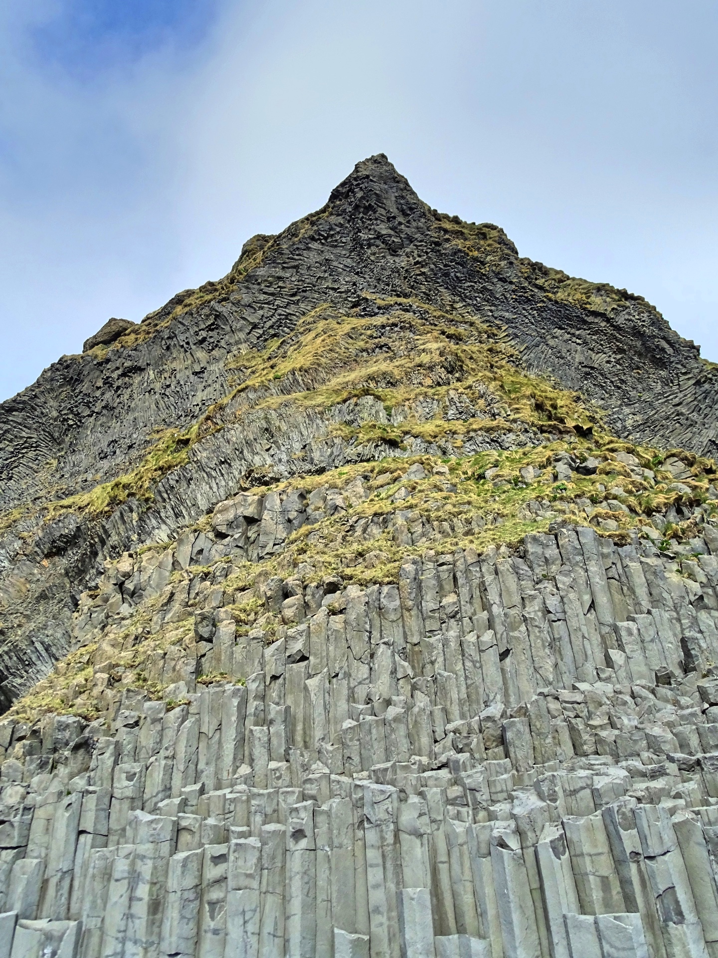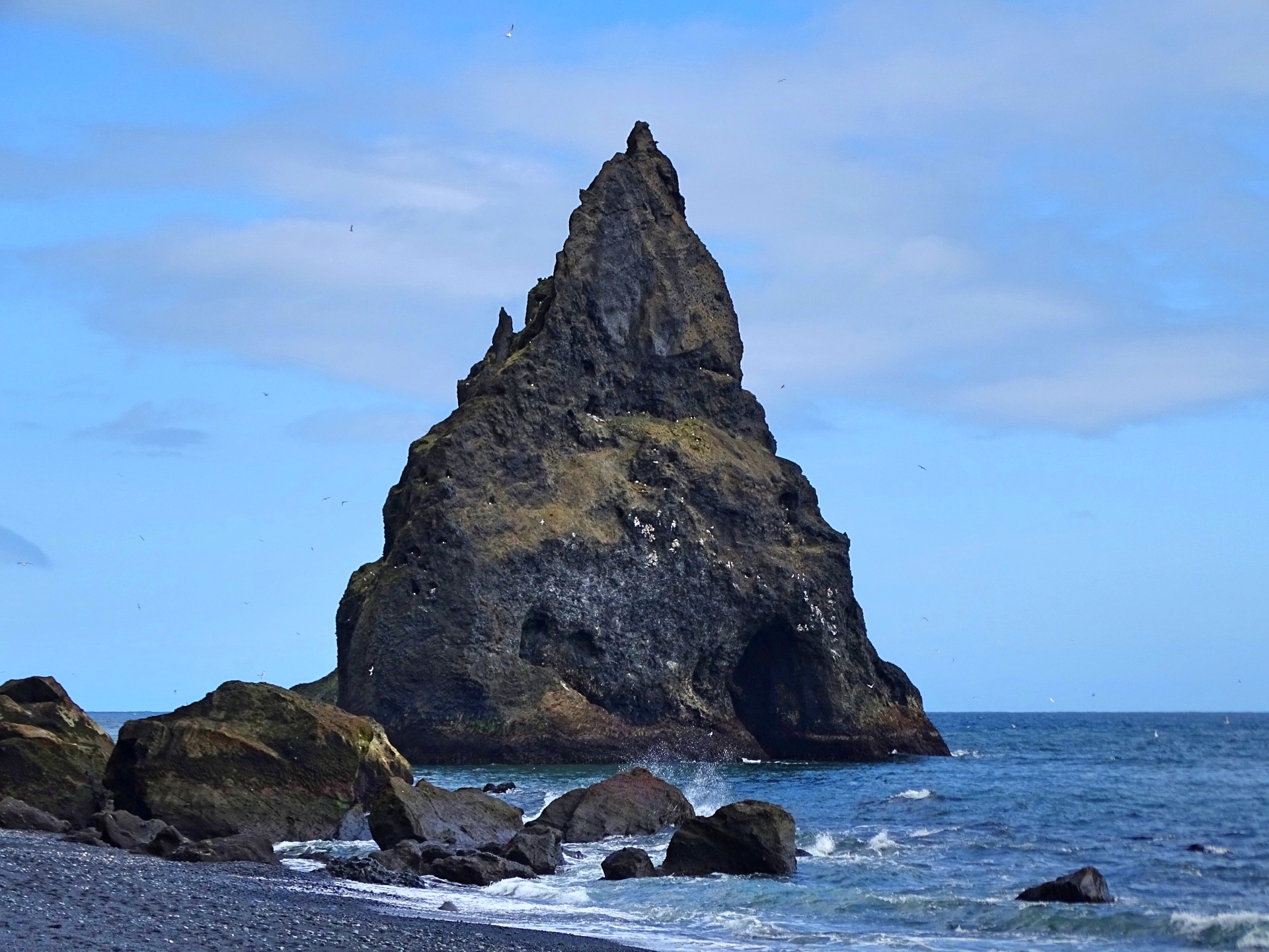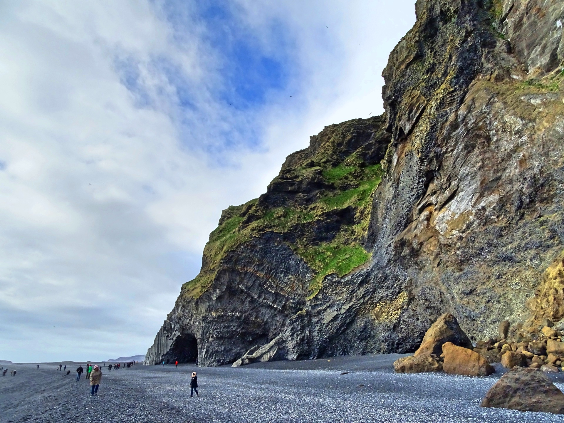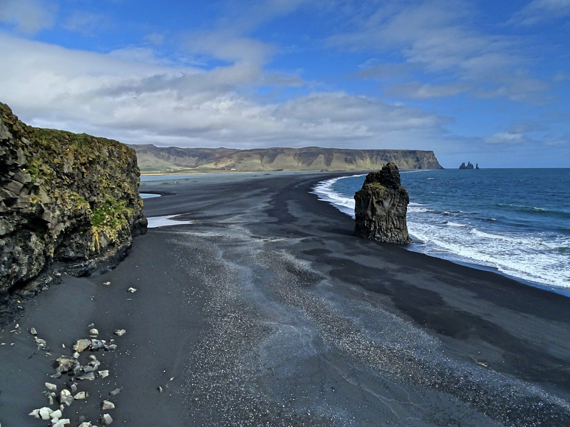 Fährt man wieder zurück auf die Hauptstraße und von dort Richtung Vík í Myrdal, kann man zum Strand von Reynisfjara abbiegen. Dieser ist gleich durch mehrere Sehenswürdigkeiten bekannt: Der schwarze Kiesstrand, die aus spektakulär geformten, eckigen Felssäulen bestehenden Klippen und Höhlen und die drei aus dem Wasser herausragenden, spitzen Felsen „Reynisdrangar“, die der Sage nach im Sonnenlicht zu Stein erstarrte Trolle sein sollen.