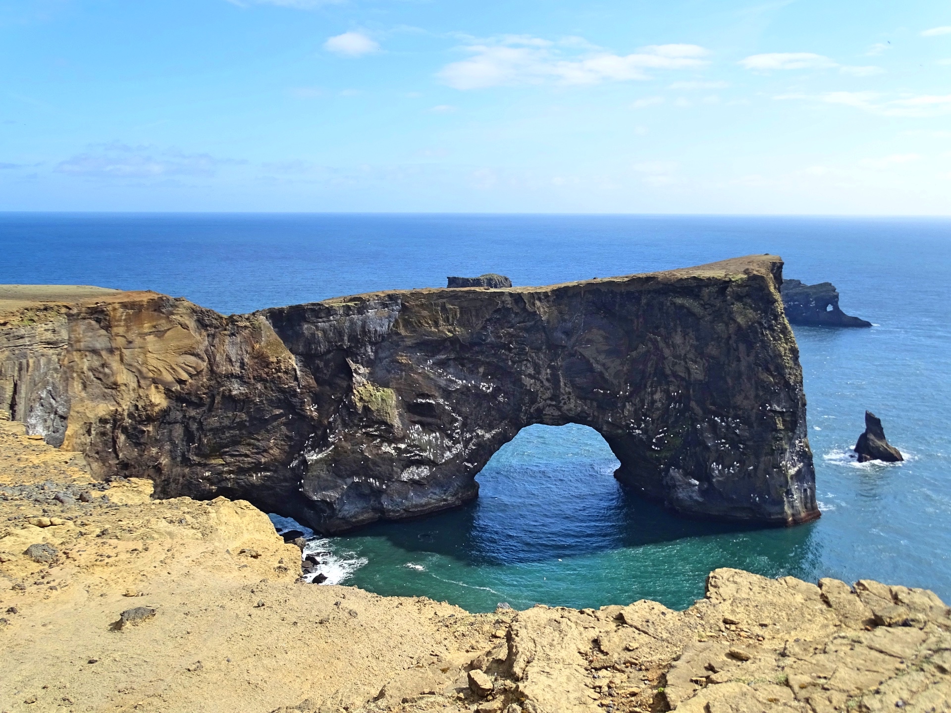 Noch etwas weiter Richtung Süden kam ich in Dyrhólaey an. Die felsige Halbinsel bietet mit den unterschiedlichen Aussichtspunkten grandiose Ausblicke auf das Meer, den „Torbogen“-Felsen, die schwarzen Strände und die vielen in den Felsen nistenden Vögel. Besonders oben am Leuchtturm ist die Aussicht atemberaubend. Die Auffahrt zum Plateau war allerdings mit meinem nicht geländegängigen Mietwagen ein kleines Abenteuer, welches zum Glück gut ausging.