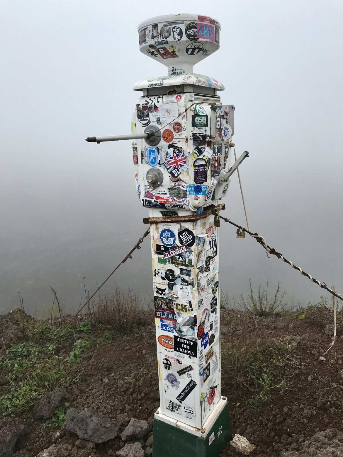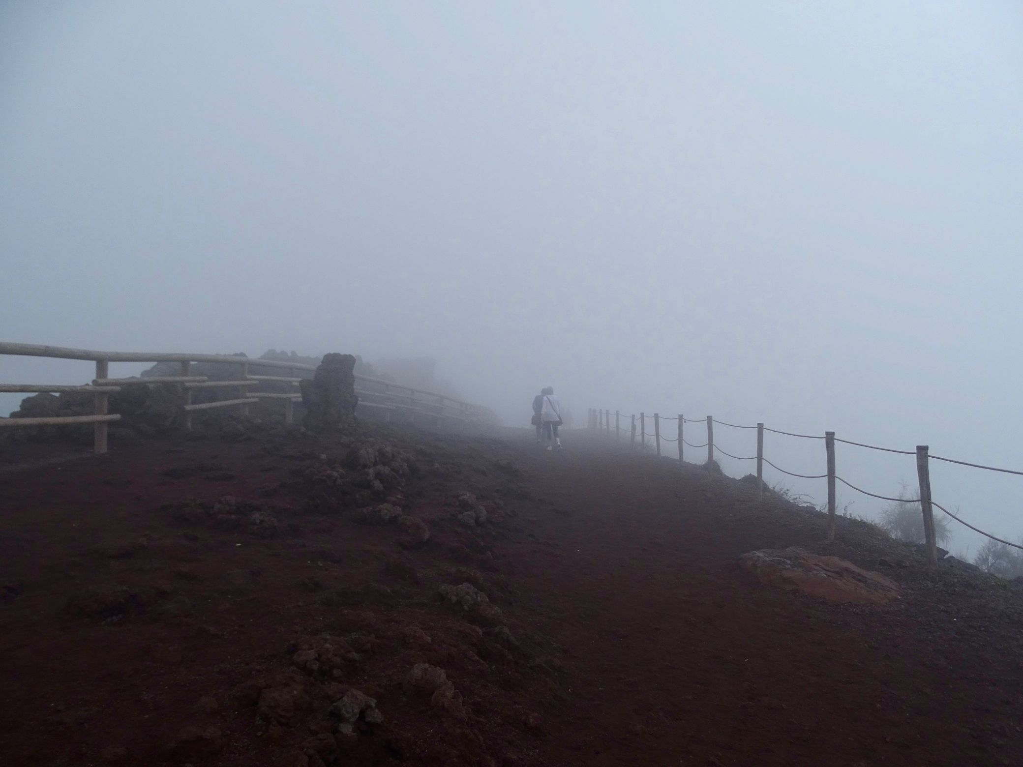 Weitere 25 Minuten später, nach einem etwas steileren Anstieg als zuvor, kamen wir dann endlich am nebelverhangenen Krater an. Zumindest hin und wieder wechselten sich Niesel und Sonnenschein ab, so dass wir zwischenzeitlich ein wenig die Aussicht genießen konnten.