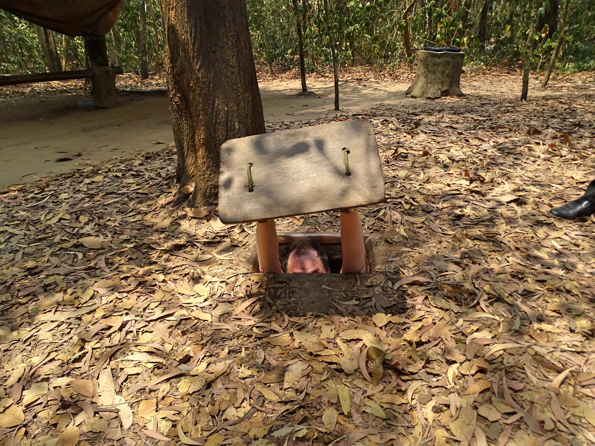 Am nächsten Morgen ging es mit dem Bus zu den Tunneln von Cu Chi, die sechzig Kilometer außerhalb von Ho-Chi-Minh-City liegen. In den sechziger und siebziger Jahren entstand hier ein ausgedehntes und autarkes Höhlensystem, in dem sich die Vietcong vor dem US-Militär versteckten. Wenn man sich einmal durch die engen, stickig-heißen Tunnel (die sogar noch extra für Touristen vergrößert wurden) gezwängt hat, kann man noch weniger glauben, dass sich hier Menschen jahrelang aufgehalten haben.