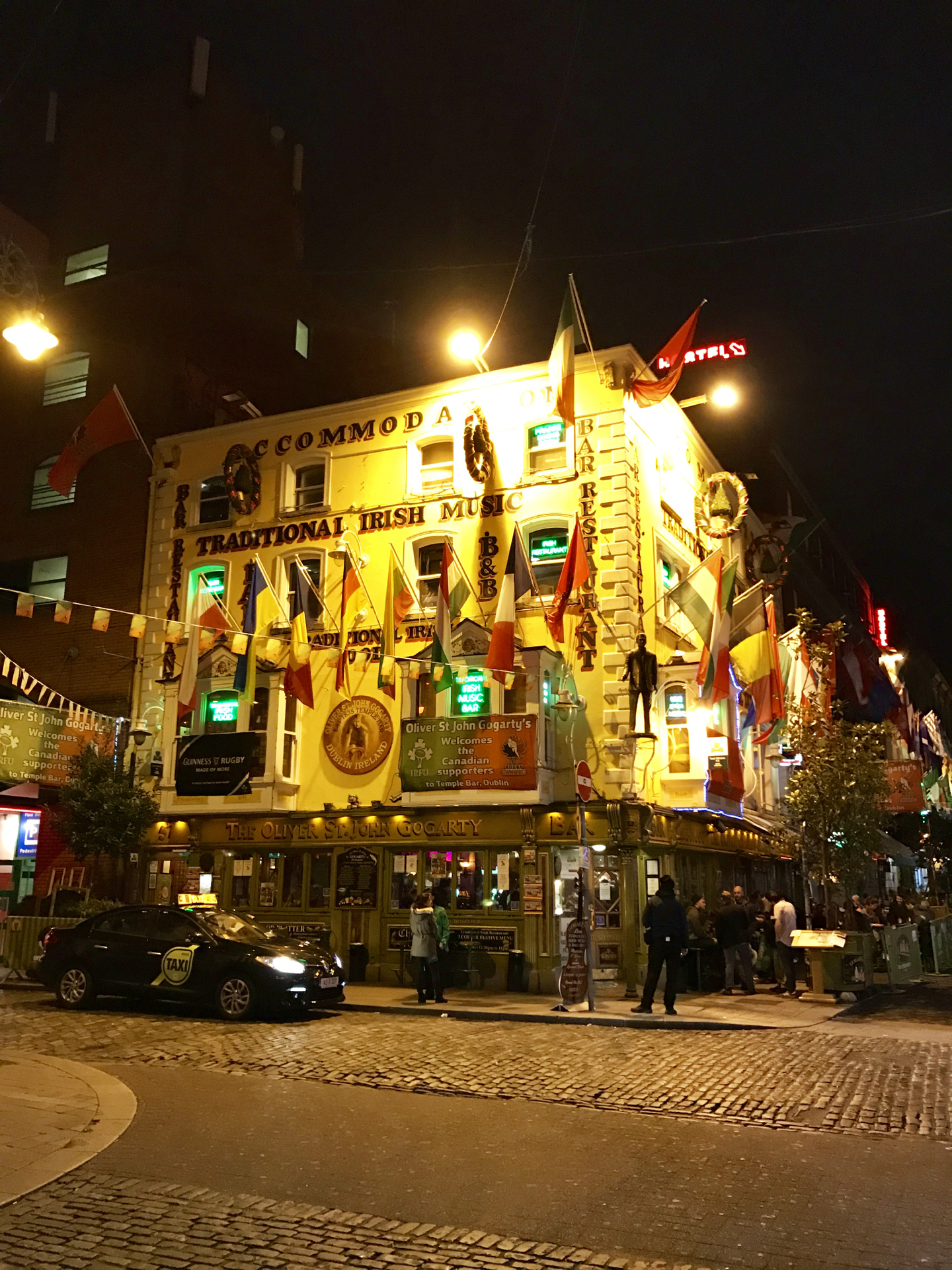 Wir kehrten in „The International Bar“ ein, die von außen schon ein wenig runtergerockt daherkam. Wir wagten es dennoch und wurden nicht enttäuscht: viele Leute standen in einem schlauchförmigen Raum mit einer großen Theke und eine Band spielte Coverversionen von Rock- und Folksongs. Hier fühlte man sich gleich wohl. Angeschlossen ist hier eine hauptsächlich für Comedy genutzte Bühne, die schon für viele irische Comedians ein Sprungbrett war. Wir fanden einen Platz an der Bar und lauschten der Coverband.